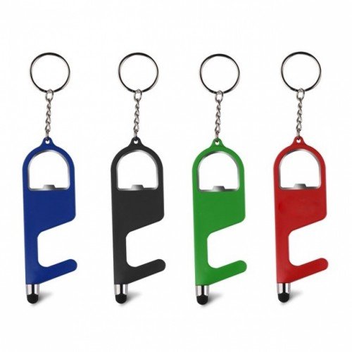 Descrição: Chaveiro plástico de material antibacteriano com funções de abridor de garrafa, touch screen e aciona superfícies sem o contato físico.