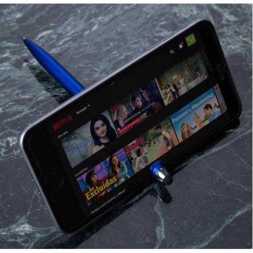 Descrição: Caneta plástica com suporte para celular e tela sensível ao toque. Carga e acionamento por rotação.